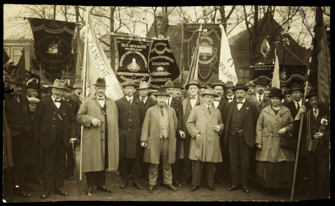 De kop van de 1 mei 1924 optocht met: van links naar rechts bestuur van de afdeling Zaandam der SDAP en de Zaanse Bestuurdersbond, de heren K. Prins, J.C. Jacobs, A.N. v.d. Berg, R. Plooijer, J. Melk, A. de Vries, W. Worp, J.J. van Doorn en mevrouw Spronk-Koerse.