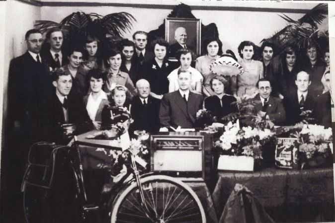 Ton van Wijngaarden kon ons ook nog de originele foto leveren zodat alle personen er correct op komen te staan. De gelegenheid was het jubileum van dhr. C. Smienk dat wordt wel duidelijk aan de hand van alle geschenken die rondom staan; o.a. een fiets, een radio, een staande lamp. Dhr. Smienk was hoofd van het administratiekantoor.