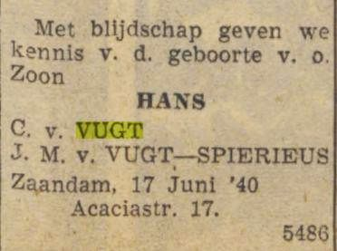 Cornelis van Vugt trouwt op 31 mei 1939 in Amsterdam met Johanna Maria Spierieus, geboren in Zaandam op 7 juni 1911. Het echtpaar woont in Zaandam, in de Acaciastraat nummer 17. Cornelis werkt in een munitiefabriek en is onder meer controleur artillerie-inrichtingen.