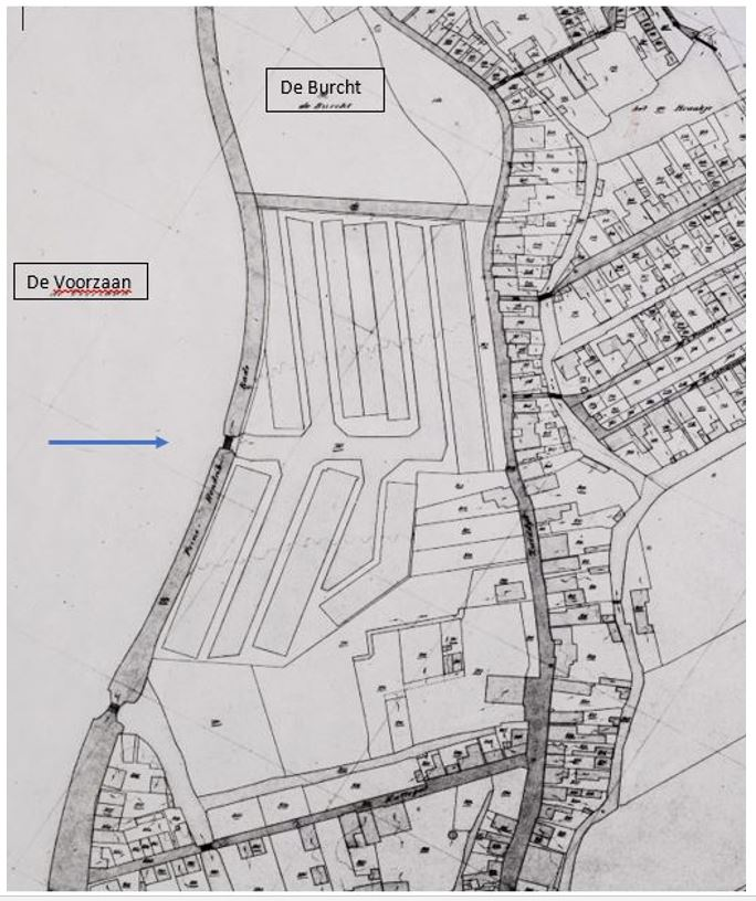 Rechts op de kadasterkaart uit 1900 is het complex van William Pont al gereed. De grachten zijn gegraven en de coupure, de doorgang van de Zaan naar het binnenwater is gemaakt. Het is de eerste doorgang, ongeveer in het midden van de kaart (blauwe pijltje).