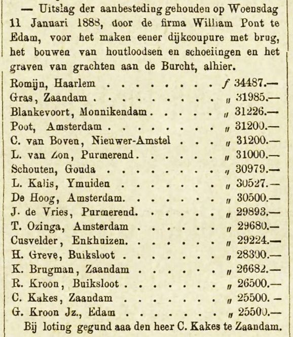 Van deze bedrijven waren er twee het goedkoopste C. Kakes uit Zaandam en G. Kroon Jz., uit Edam en Kakes kreeg bij loting het werk gegund voor een bedrag van f. 25.500,–.