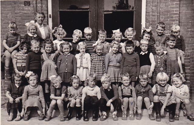 Nou, dit is ‘m dan, mijn kleuterschoolfoto. Ik zit eerste rij vierde van rechts, 6e van rechts is Lydia Hooijschuur, 2e rij, eerste rechts is Peter Baas en helemaal links op het muurtje zit Jan Schoen. En natuurlijk juf Hempenius, die er vanaf de opening bij was. Andere namen heb ik helaas niet paraat. Wie het weet mag ze doorgeven.