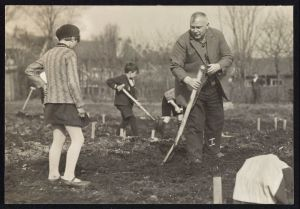 Maar er gaat toch niets boven het echte werk; met je handen in de grond. Een zaadje in een kuiltje doen en zien dat er iets uit gaat ontstaan. Velen hebben zo het verschil leren kennen tussen onkruid en plantjes. Hebben leren schoffelen en harken of omploegen zoals op de foto dhr. Frederiks aan leerlingen laat zien.