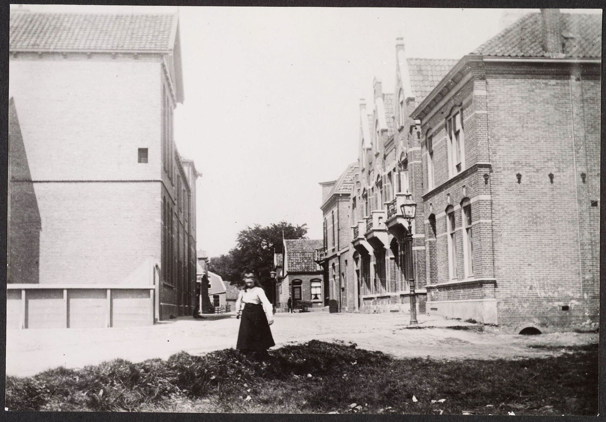 Links de nieuwe school, het meisje staat in de Czarinastraat en we kijken richting Gedempte Gracht. Het is te zien dat er in dit gebiedje nog geen sprake was van een echte straat. De eerste naam was Schoolstraat en pas later werd het Czarinastraat.
