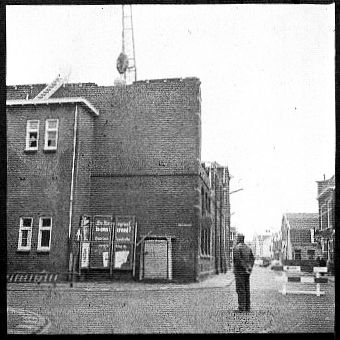 In 1974 is het gebouw gesloopt. De man staat in de Czarinastraat hoek Golofkinstraat en we kijken richting Czaar Peterstraat.