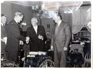 Op de foto staat dhr. Lastdrager in het midden. Gezien het handen schudden misschien wel bij de receptie ter opening van de garage. Dit zal, gezien de tafeltjes en kleedjes in een café of restaurant zijn gedaan.