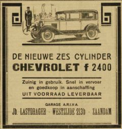 De garage adverteert in 1929 nog met een nieuwe Chevrolet 6 cylinder maar dan is het denk ik gedaan met het dealerschap omdat het jaar daarna garage Zwart aan Plein ’13 in Wormerveer zich officieel dealer van Chevrolet noemt in een advertentie. Er is dan ook niets meer te vinden is over de garage van dhr. Jb. Lastdrager want na de A.R.I.V.A-garage komt er in 1933 in het pand een autoverhuurinrichting onder de naam ‘Kokkies Luxe Autoverhuurinrichting’.