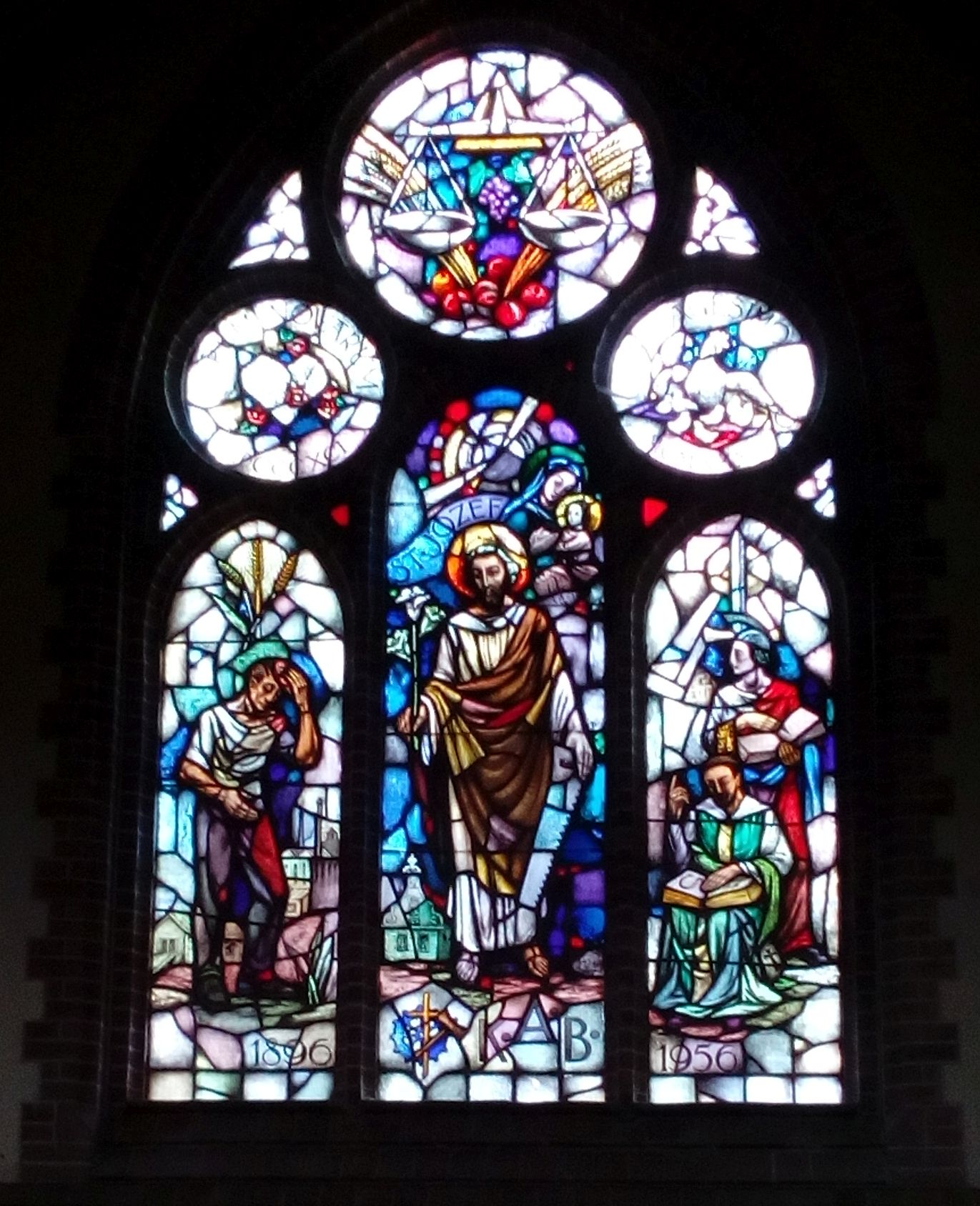 Een ander raam is in 1956 geschonken door de katholieke arbeiders bij gelegenheid van het 60 jarig jubileum van de Katholieke Arbeiders Beweging (K.A.B.). In het midden staat de heilige Jozef, hij was een timmerman, met een zaag in z’n hand en aan z’n voeten een Zaans huisje. Niet te vergeten links een arbeider die zich het zweet van z’n voorhoofd wist. De arbeiders kenden het gezegde ‘in het zweet uws aanschijns zult gij uw brood verdienen’ uit ervaring want in die tijd werkten de arbeiders nog 12 à 14 uur per dag.
