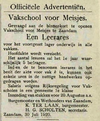 De gemeente plaatste advertenties om docenten te werven en er werden in de kranten tarieven gemeld voor het schoolgeld.