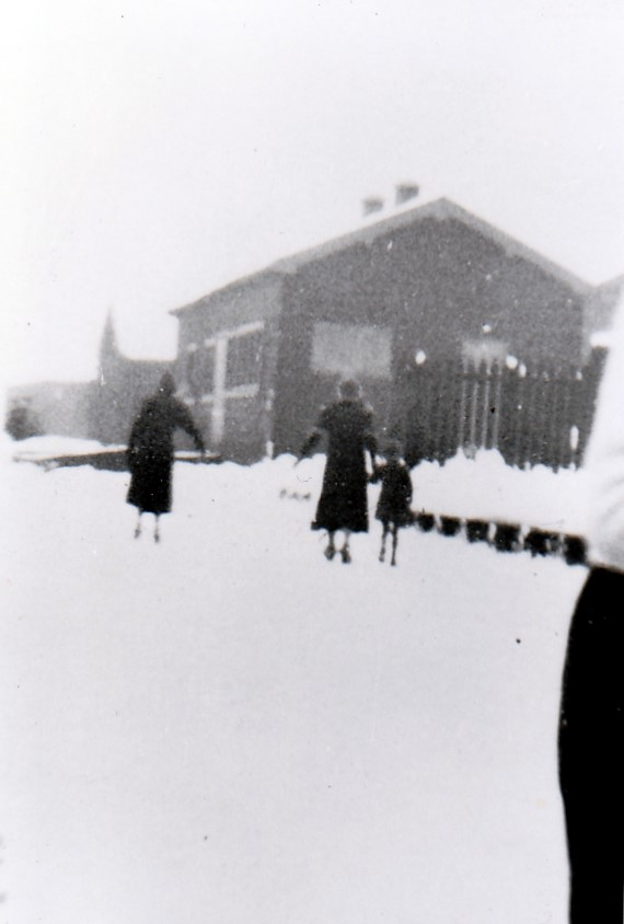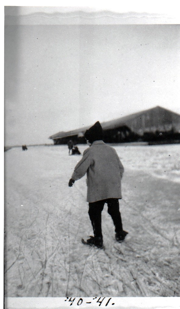 Schaatsers in de winter van '40–'41. De mensen op de eerste foto lopen naar de fabriek van Exter. Het kind op de tweede foto is de dochter van dhr. Zeeland. De loods op de foto van het meisje is De Morgenster die verder in het land lag.